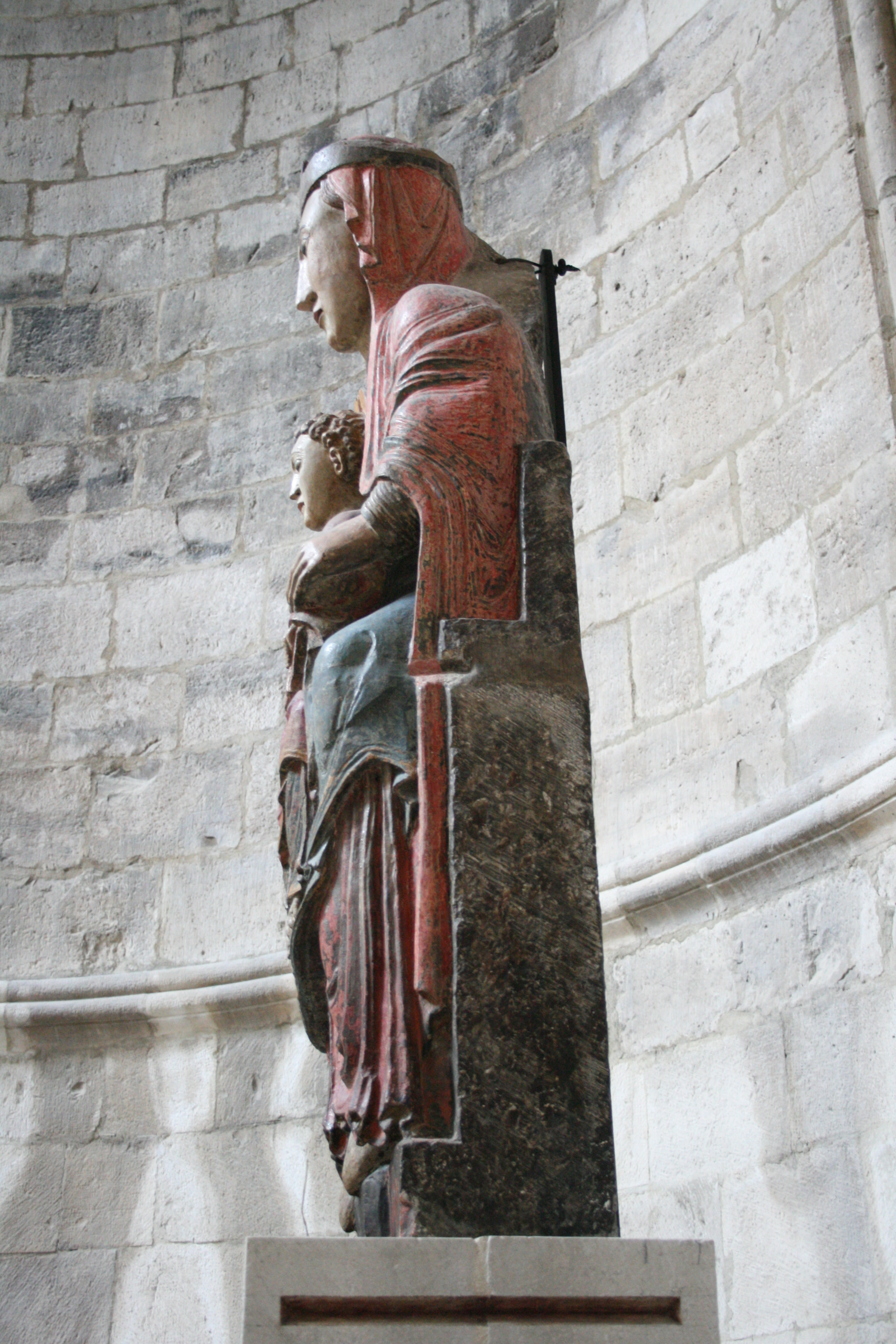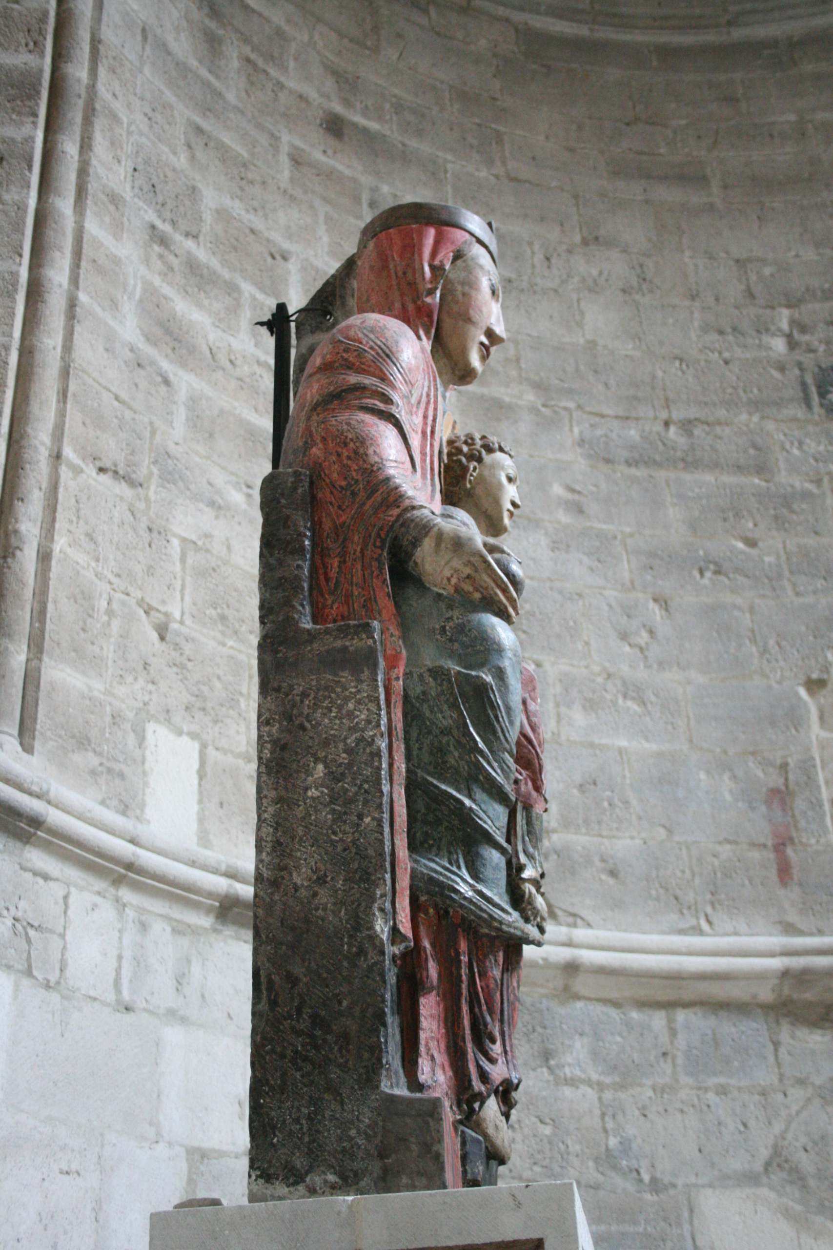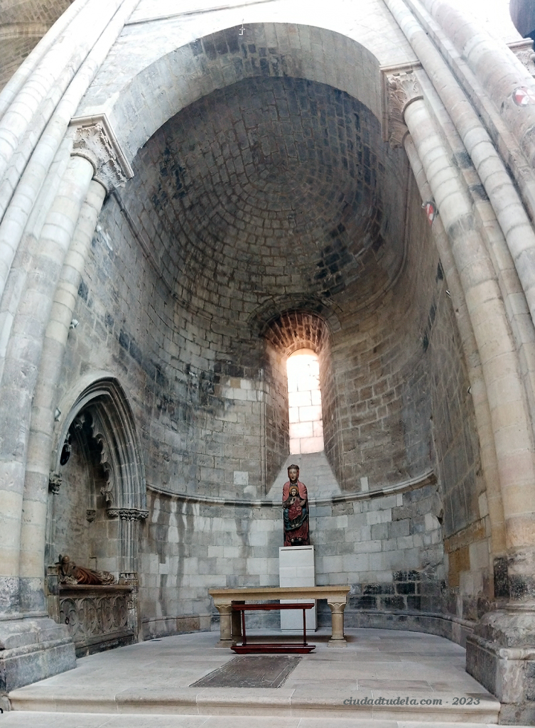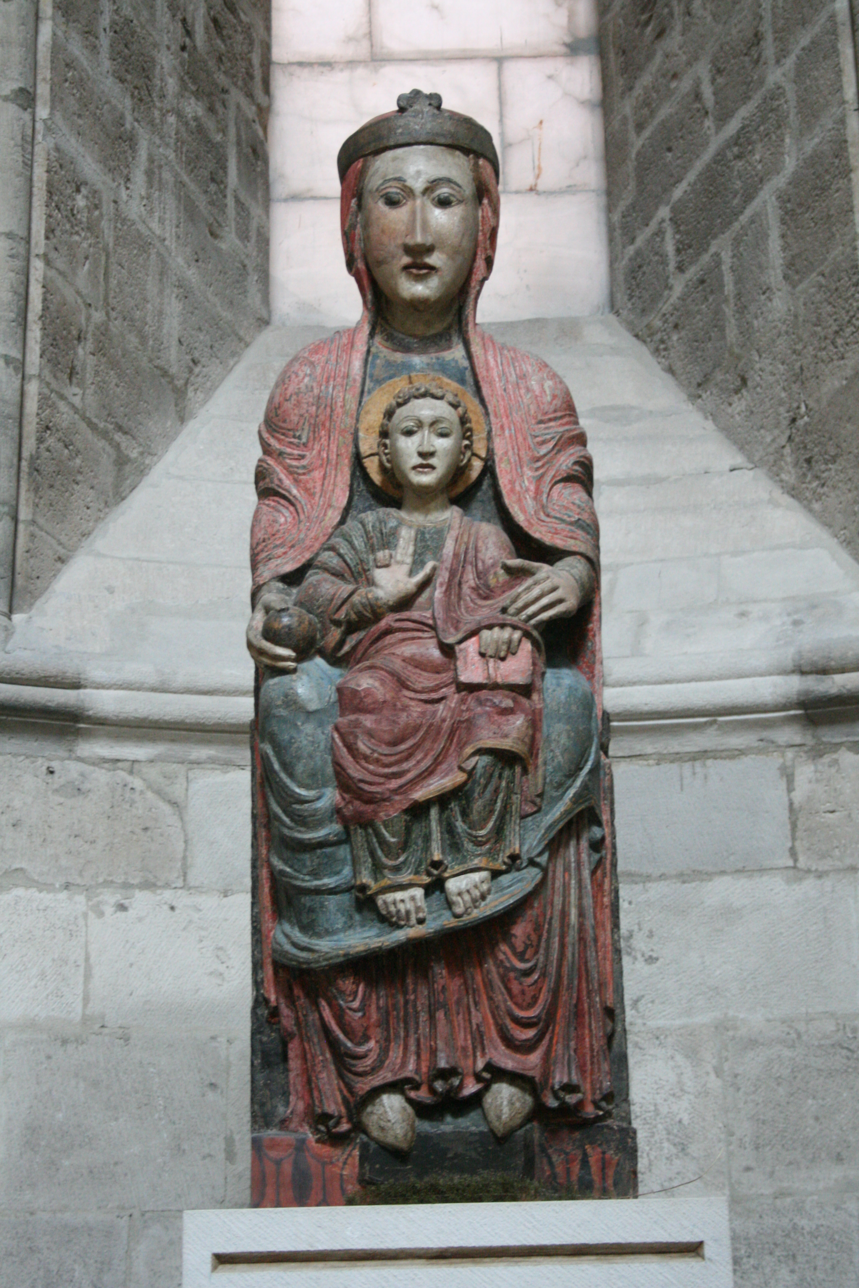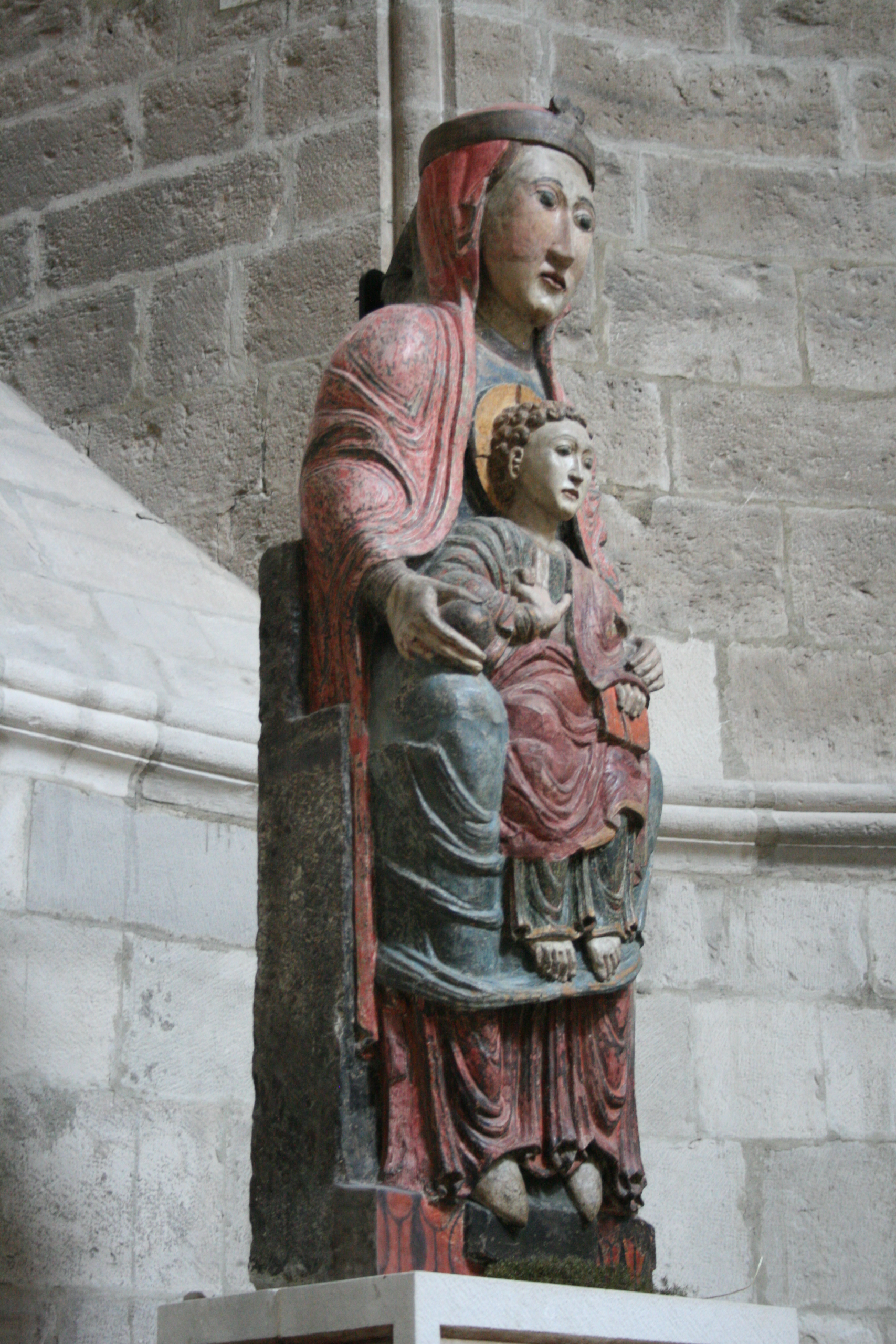 La imagen, que data del siglo XII, es anterior a la catedral y tratándose de una talla románica exenta de gran tamaño, realizada en piedra por el mismo taller escultórico que trabajó en el claustro. Conserva parte de su policromía original y pertenece al modelo Sedes Sapientae. Parece ser la imagen en cuyo honor se realiza la Colegiata de Santa María (actual Catedral), ocupando el altar mayor hasta que se colocó en este lugar el retablo gótico hispano-flamenco. Se trata de una imagen relicario, ya que en su interior conserva un hueco en el que se custodiaban reliquias.